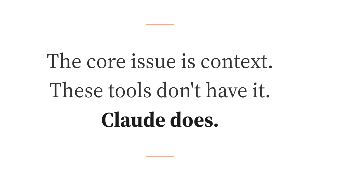 I just kept re-explaining what I was doing in Claude… The core issue is context. These tools don’t have it. Claude does.