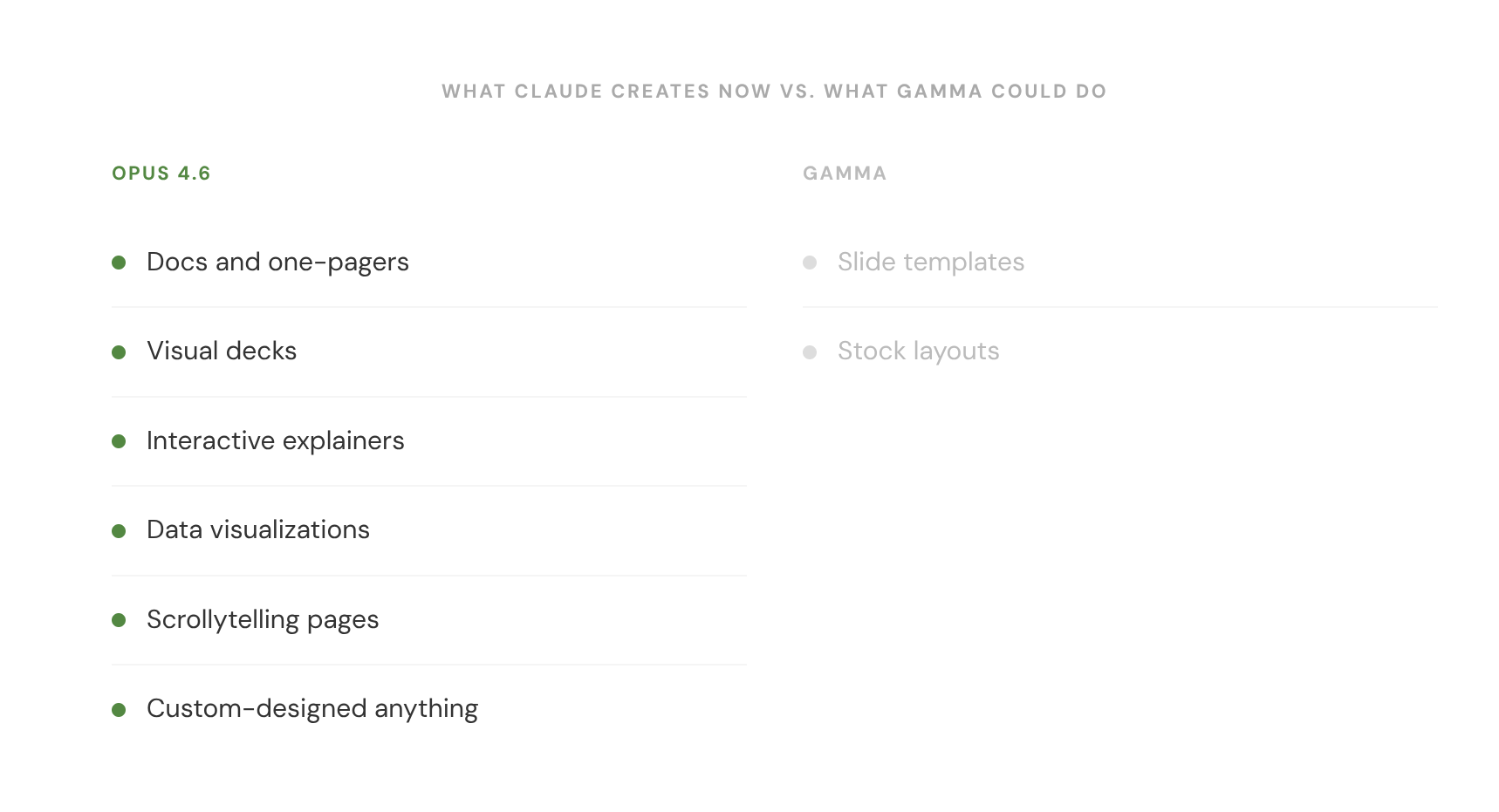 With Opus 4.6, Claude is genuinely good at design now. like, good good. and it can go way beyond a slide deck… interactive explainers, one-pagers, visual docs, stuff Gamma can’t even attempt.