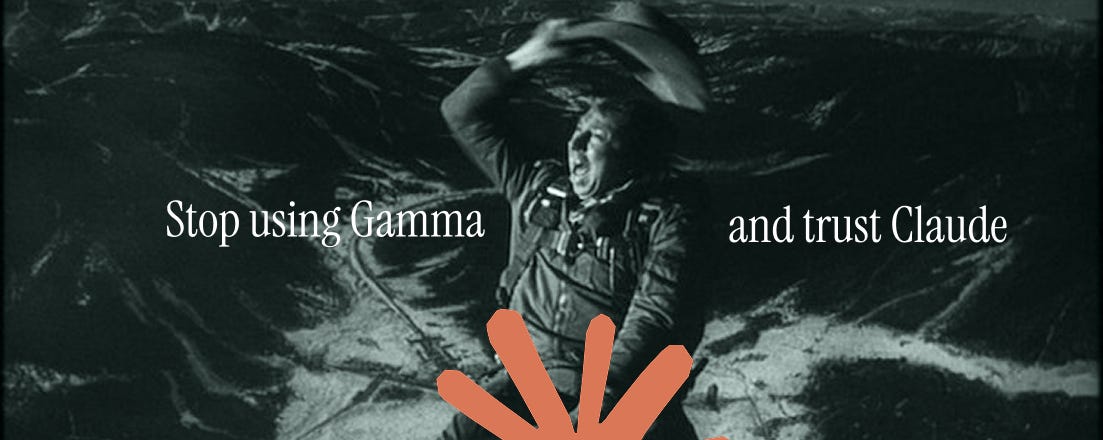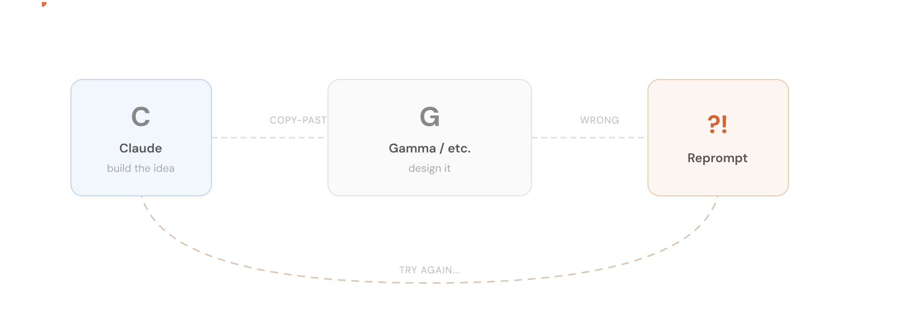 I’d spend an hour in Claude working through an idea, then i’d paste it into Gamma and get back something that looked like last year’s model design (probably was). So I’d reprompt. and reprompt. basically redoing everything I’d already done in Claude.